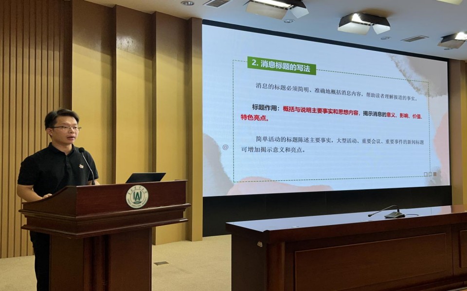 李帅围绕新闻写作要领开展培训,他以学院新闻为例,向学生干部讲解了新闻的定义和分类,介绍了新闻写作的基本方法、采编技巧以及照片拍摄要求,使学生干部对新闻写作有了更深入的理解和掌握。